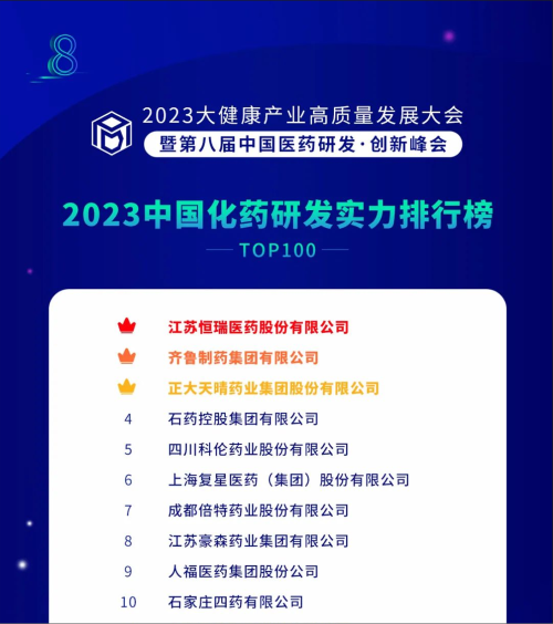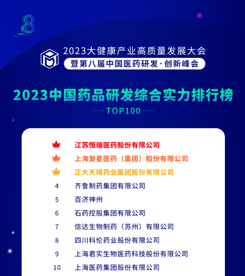 由药智网、中国药业杂志社主办的2023大健康产业高质量发展大会暨第八届中国医药研发•创新峰会于6月16日开幕,会上发布了《2023中国药品研发实力排行榜》系列榜单,PA视讯医药凭借深厚的创新研发实力再创辉煌:荣登《2023中国药品研发综合实力排行榜TOP100》榜首、《2023中国化药研发实力排行榜TOP100》榜首。值得一提的是,今年是PA视讯医药连续第6年入选《中国药品研发综合实力排行榜》榜首。