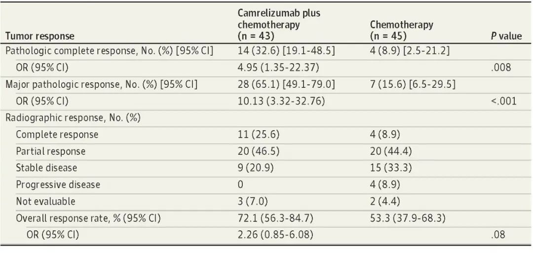 北京时间8月3日,PA视讯医药创新药卡瑞利珠单抗联合化疗(Cam+CT)对比化疗(CT)新辅助治疗ⅢA/ⅢB (T3N2) 期非小细胞肺癌(NSCLC)结果在线发表于国际权威期刊JAMA Oncology[1]。该研究是由空军军医大学唐都医院姜涛教授、雷杰教授团队联合陕西省肿瘤医院雷光焰教授团队、兰州大学第二附属医院王成教授团队共同参与的一项随机对照、多中心、Ⅱ期临床研究(TD-FOREKNOW,NCT04338620)。研究结果显示,与化疗相比,卡瑞利珠单抗联合化疗新辅助治疗NSCLC显著提高了病理完全缓解(pCR)率(32.6% vs 8.9%,OR=4.95,95% CI :1.35-22.37, P =0 .008),且安全性良好。本研究是卡瑞利珠单抗新辅助治疗可切除NSCLC患者的首个随机对照研究,为NSCLC新辅助免疫治疗再添新证。